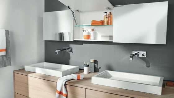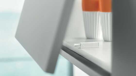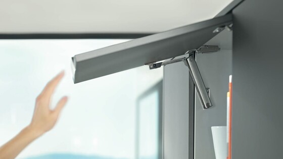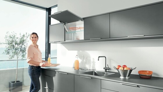 Thanks to its slim construction, AVENTOS HK-XS provides enormous scope for the design of tall units and wall cabinets. Even cabinets with little depth are now possible. The solution has a symmetrical lift mechanism. For small and light fronts, use a single lift mechanism on one side of the cabinet. For larger and heavier fronts, attach a lift mechanism to both sides.