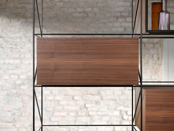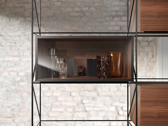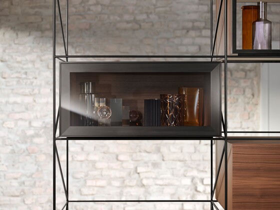 The integrated lift system remains invisible when closed – even with glass fronts. The visible parts of AVENTOS HKi seen when open shows an elegant onyx black.