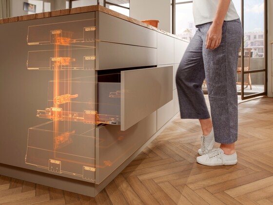Notre assistance électrique à l’ouverture pour toute la cuisine : SERVO-DRIVE pour les blocs-tiroirs et portes relevables, SERVO-DRIVE uno en tant que solution individuelle pour le bloc-tiroir à déchets et SERVO-DRIVE flex pour les appareils encastrés avec faces sans poignée.