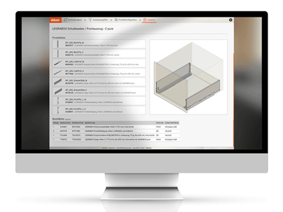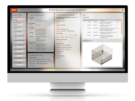 Mit dem Produktdaten-Service stellen wir Ihnen Blum-Beschlägedaten und -Konfigurationslogiken inklusive einer Programmschnittstelle (REST API) als Komplettpaket zur Integration in ihre Software zur Verfügung. Einmal integriert, sind darin alle gängigen Beschlägedaten von Blum enthalten, die der Anwender braucht. Regelmäßige Updates geprüfter Daten sorgen für Aktualität.