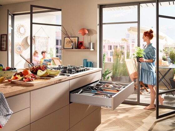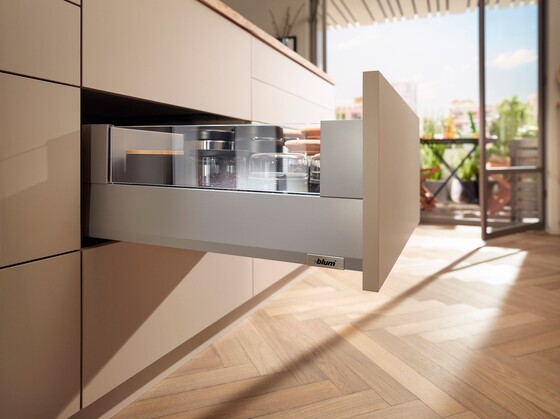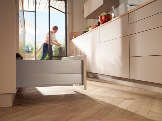 Blum provides top functionality to ensure that MERIVOBOX inspires furniture for a lifetime. Low-friction nylon rollers and the synchronisation of drawer profile and roller carriage runner deliver a feather-light glide. Thanks to interfaces for additional components, MERIVOBOX can also be retrofitted with motion technologies and side stabilisation. Standardised adjustment, fronts that can simply be clipped on and off, precise zero position - all these features make assembly quick and easy. The new box system simplifies furniture manufacturing and yet gives you the possibility to create a broad range of pull-outs.
