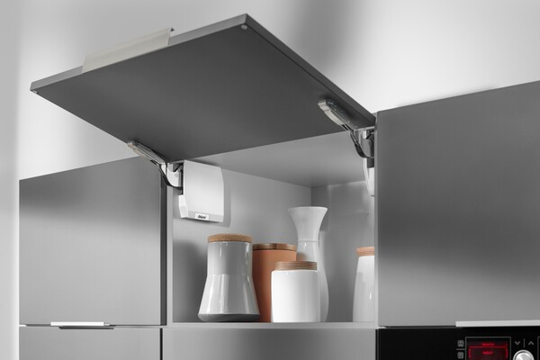 The AVENTOS HK-S stay lift allows you to make optimal use of the storage space available, e.g. above refrigerators or larder units. The compact lift mechanism fits snugly into small cabinets and excels in terms of assembly ease and user convenience.