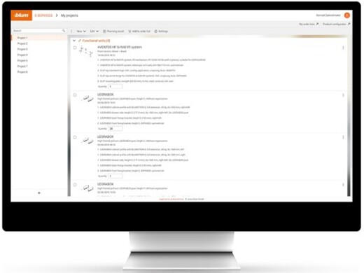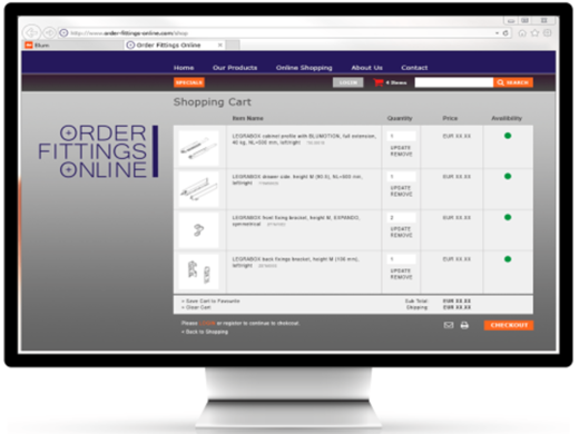 Um den Bestellvorgang beim Onlinekauf von Beschlägen zu erleichtern, bieten wir eine Schnittstelle zu den Online-Shops von Beschlagfachhändlern an. Die mit dem Produkt- bzw. Korpuskonfigurator ermittelten Stücklisten lassen sich damit direkt in das jeweilige Bestellsystem exportieren.