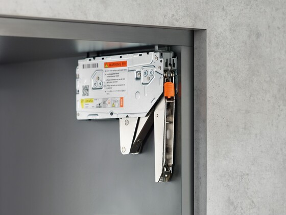 La position de montage des ferrures AVENTOS HK top est la même pour toute application et toute hauteur de corps de meuble. Si le réservoir de force est réglé avec précision en fonction du poids de la façade, la porte relevable pivotante s'ouvre, se ferme et s'arrête toujours en toute fiabilité.