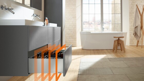Avec BLUMOTION, chaque meuble ferme en douceur et en silence – indépendamment du poids du bloc-tiroir, de la porte ou de la porte relevable.