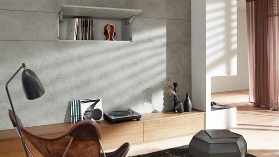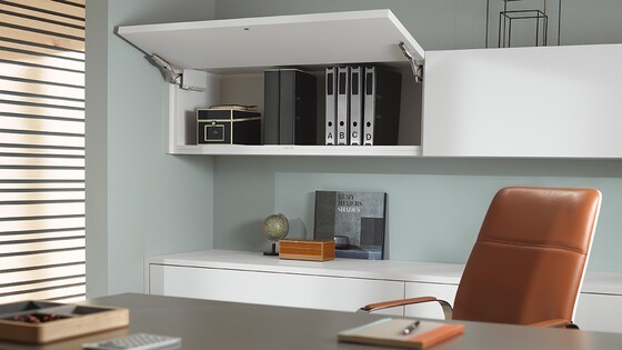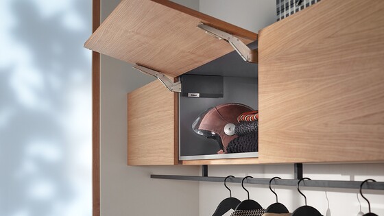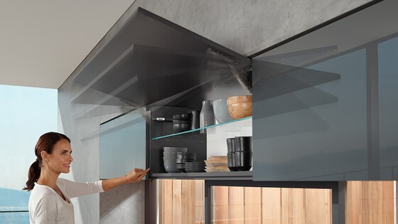 AVENTOS HK top gaat onopvallend op in hoge kasten en bovenkasten. Met zijn minimalistisch ontwerp heeft het klapdeursysteem al verschillende prijzen gewonnen.