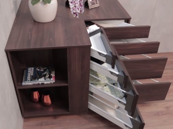 Com alta qualidade de movimento, extensões bastante carregadas são abertas facilmente. Além do sistema box TANDEMBOX ou gavetas de madeira com os sistemas de corrediças MOVENTO ou TANDEM, o armário é implementado de maneira flexível. A largura recomendada vai de 900 a 1.200 mm.