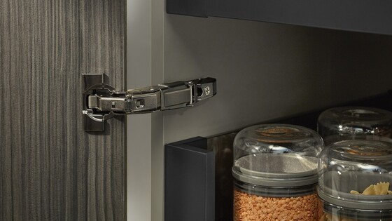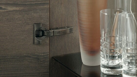 Móveis escuros vivem da elegância simples – tanto por dentro como por fora. Dobradiças em preto-ônix incorporam-se discretamente ao móvel, estabelecendo diferenciais. Para mais liberdade de composição em construção de móveis de alta qualidade, sem comprometer o design.