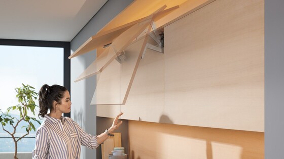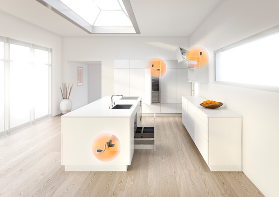 Nosso sistema eletrônico de auxílio de abertura para toda a cozinha: SERVO-DRIVE para extensões e portas de elevação, SERVO-DRIVE uno como solução individual para a extensão da lixeira e SERVO-DRIVE flex para aparelhos embutidos com frentes sem puxadores.