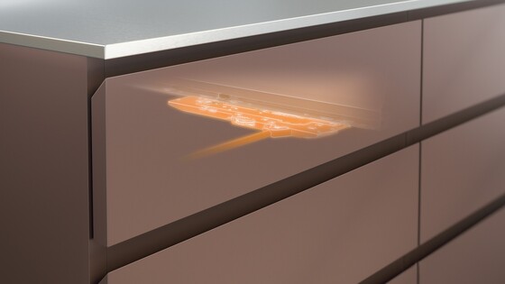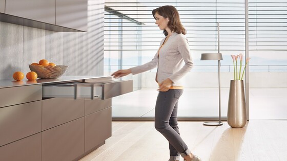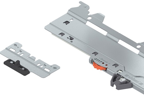 Para frentes sem puxadores, MERIVOBOX pode ser equipada com o sistema de auxílio de abertura mecânico TIP-ON BLUMOTION. A inovadora guia de armário em formato L totalmente reformulada da MERIVOBOX oferece a base para a combinação com TIP-ON BLUMOTION. Com as diversas unidades TIP-ON BLUMOTION, podem ser realizados diferentes comprimentos nominais e faixas de pesos. Todos os outros componentes são de uso universal.