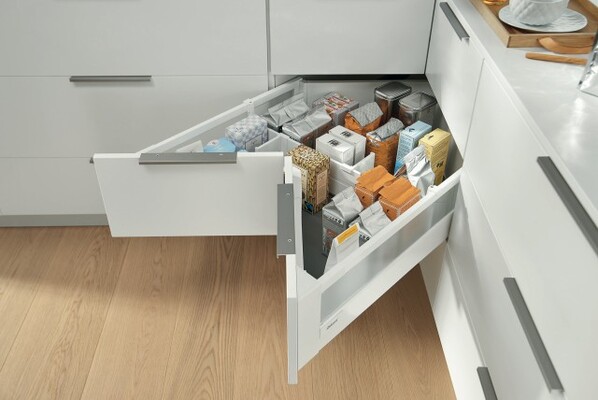 The SPACE CORNER cabinet can be implemented with standard components. You can use wooden drawers with MOVENTO or TANDEM runners or the TANDEMBOX box system. There is a wide range of cabinet dimensions to choose from, but the recommended width is between 900 and 1200 mm.