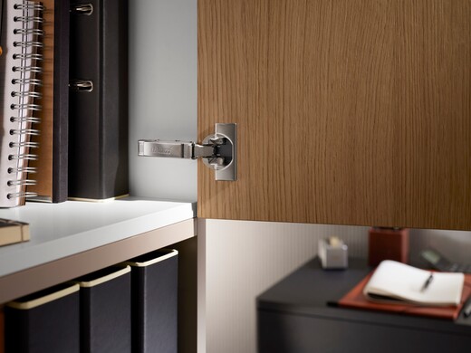 Die im Scharniertopf integrierte BLUMOTION-Dämpfung ermöglicht ein schlankes Design, das CLIP top BLUMOTION 105° harmonisch mit dem Möbel verschmelzen lässt.