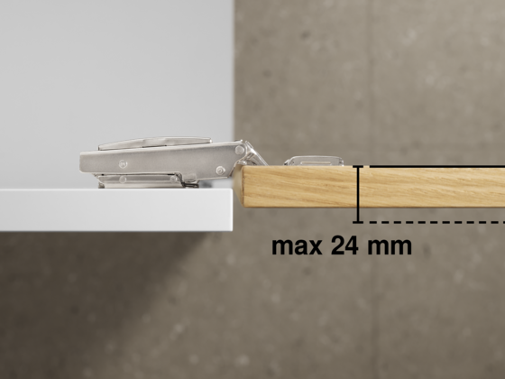 Das Scharnier ist für Frontdicken bis ca. 24 mm geeignet und empfiehlt sich dank geringer Mindestfugenwerte für eine Vielzahl von Anwendungen.