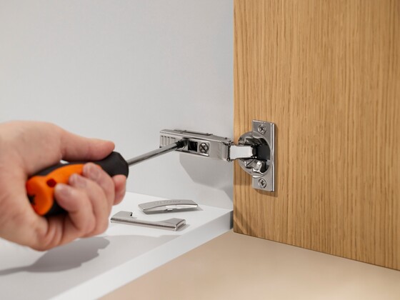 CLIP top BLUMOTION 105° besticht durch die gewohnte dreidimensionale Fronteinstellung mit stufenloser Tiefenjustierung über eine Gewindeschnecke.