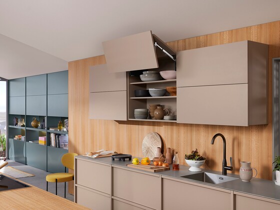 Klappen im Ober- und Hochschrank sind besonders praktisch: Die Bewegungs- und Kopffreiheit bleibt jederzeit erhalten. Während der Küchennutzung können die Klappen ungehindert offen bleiben, Staugüter sind jederzeit griffbereit.