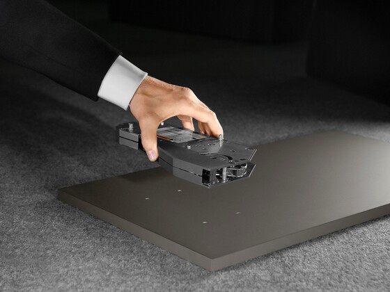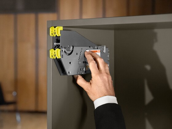 Mit AVENTOS top haben Sie zwei Möglichkeiten, den Kraftspeicher zu montieren: entweder mit Systemschrauben oder mithilfe der integrierten Positionsfindung. Egal wie, die Montage des Kraftspeichers gelingt schnell, einfach und fehlerfrei – ohne Berechnung dank fixer Befestigungspositionen. Die Kraftspeichereinstellung von vorne sowie integrierte BLUMOTION-Dämpfung und Öffnungswinkelbegrenzung lassen sich ebenfalls mühelos einstellen – all das erleichtert die Verarbeitung und Montage.