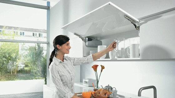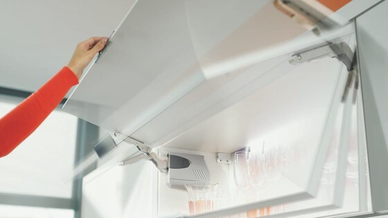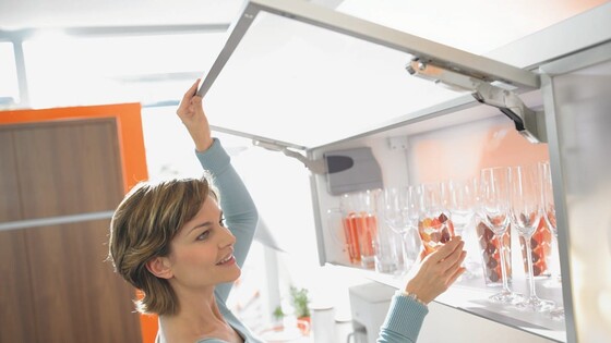 Profesionálové hodnotí komfortní výklop jako ideální řešení pro těžká čela v horní skříňce. Díky pohybu výklopu potřebuje otevřené čelo nahoře jen málo místa. AVENTOS HK se pohybuje mimo rozsah pohybu uživatele a může tak při vaření zůstat otevřený.