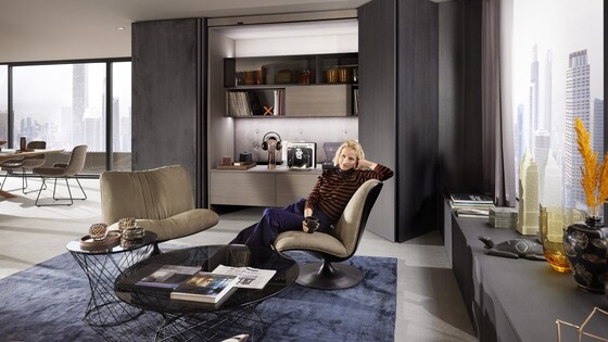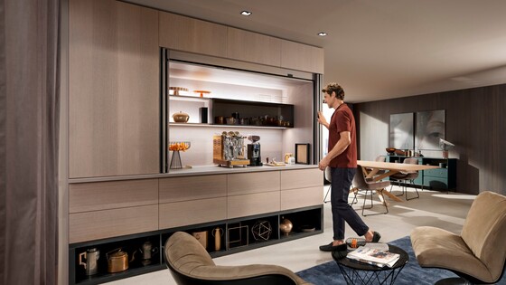 Plně otevíratelná čela řady REVEGO v zavřeném stavu zcela zakrývají kapsu a nábytkovou stěnu a podporují dokonalou linii spár a mezer. Při použití se příslušná oblast rychle otevře jemným ťuknutím a stejně rychle se zase zavře.