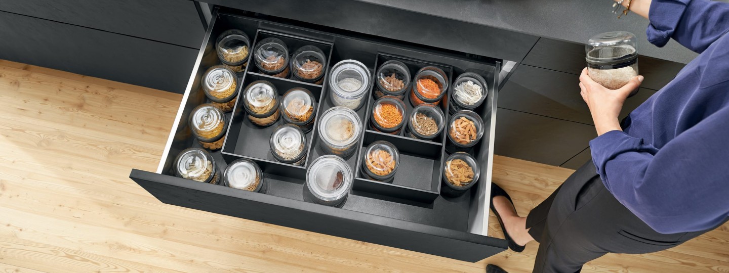 Dieser Kurzfilm zeigt den Blum-Tellerhalter in der Anwendung im Frontauszug. Am Beispiel Größe an Teller anpassen und in Frontauszug in Zone Aufbewahren verstauen.