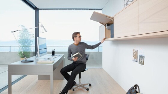 Professionelle værdsætter den komfortable klaplåge der åbner ud i rummet, som ideel løsning til tunge fronter i overskabet. Takket være klaplågens bevægelse, kræver den åbne front kun ganske lidt plads for oven. AVENTOS HK bevæger sig fuldstændig væk fra bevægelsesområdet og kan dermed blive stående åben under madlavningen.