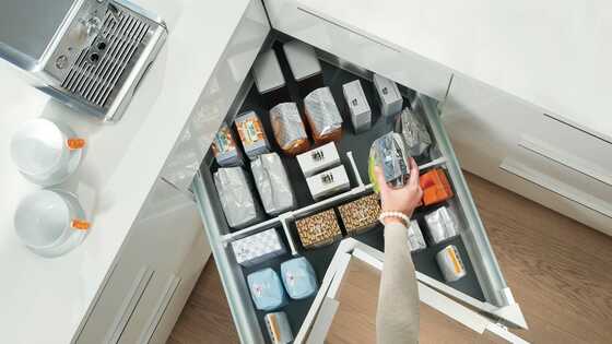 Por lo general, el espacio disponible en el rincón se utiliza demasiado poco o de manera ineficiente. SPACE CORNER es una alternativa muy fácil de usar a las soluciones convencionales para rinconeras. Mediante el empleo de módulos extraíbles totales, el espacio se aprovecha de manera óptima y se puede acceder en un solo movimiento a los artículos guardados sin necesidad de inclinarse.