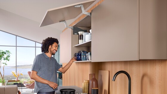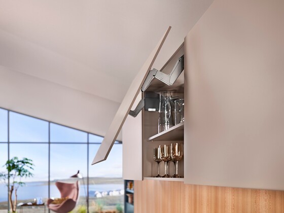 The AVENTOS HS top lift system in the wall cabinet exudes a sense of weightlessness: even large one-part fronts can be moved with the utmost ease and access to storage items is maintained at all times. It can also be used with unusual design options such as cornices or crown mouldings.