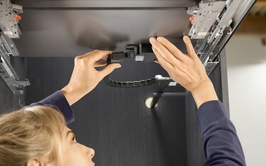AMPEROS AC se combine avec BLUMOTION, TIP-ON BLUMOTION ainsi que SERVO-DRIVE, et s’intègre facilement avec les coulisses MOVENTO et les tiroirs LÉGRABOX.