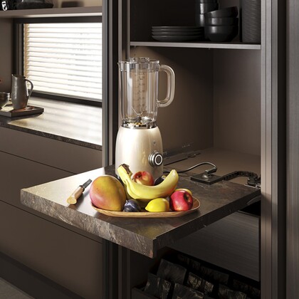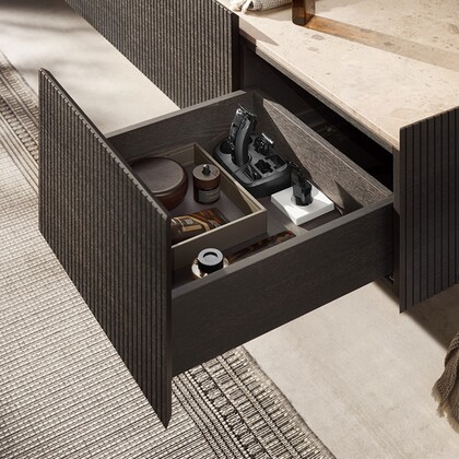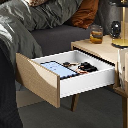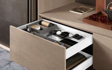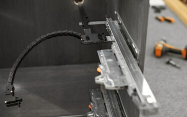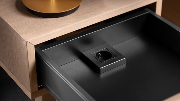 AMPEROS AC permet d'intégrer simplement une prise de courant dans le meuble. L'électricité est disponible exactement à l'endroit souhaité, sans câble apparent grâce à un passage de câble dissimulé sous le tiroir ou la tablette. Une solution pratique, discrète et esthétique !