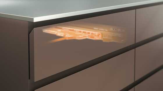 A special LEGRABOX cabinet profile has been designed to support the mechanical opening support system. Various nominal lengths and weight ranges can be implemented using the different TIP-ON BLUMOTION units available. All other components are universal.