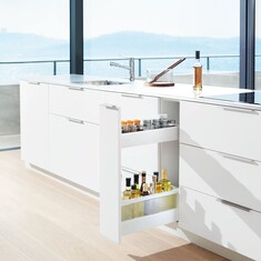 Είναι ιδιαίτερα χρήσιμο να έχετε αποθηκευτικό χώρο γύρω από τον νεροχύτη σας. Αυτό το ντουλάπι νεροχύτη χρησιμοποιεί κάθε εκατοστό του διαθέσιμου αποθηκευτικού χώρου και σας προσφέρει εύκολη πρόσβαση στα περιεχόμενα. Αφήνει τους πάγκους ελεύθερους και εξασφαλίζει ότι τα είδη για το πλύσιμο των πιάτων είναι άμεσα προσβάσιμα. Το ντουλάπι μπορεί να κατασκευαστεί με στάνταρ εξαρτήματα LEGRABOX και TANDEMBOX.