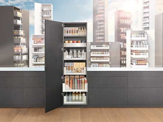 Fittings manufacturer Blum produces fittings for lift systems, pull-outs and drawers, hinges and inner dividing systems for drawers.