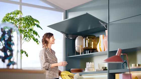 When there is limited space over a wall cabinet or tall cabinet, AVENTOS HK top is the preferred solution. The stay lift front barely protrudes above the cabinet, so that a low ceiling height is no obstacle. Even large and heavy wall cabinet fronts can be opened with ease. For handle-less fronts, SERVO-DRIVE and TIP-ON motion technologies provide electrical and mechanical support respectively.