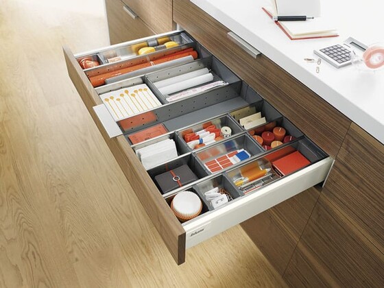 A fiókokba való tálcákkal és osztókkal valamint a kereszt és hosszanti osztókkal a kihúzókban a belső felosztó rendszer nagy kialakítási játékteret nyújt a bútorbelső rendezettségénél. Illik minden TANDEMBOX, MOVENTO és TANDEM programvonalhoz.