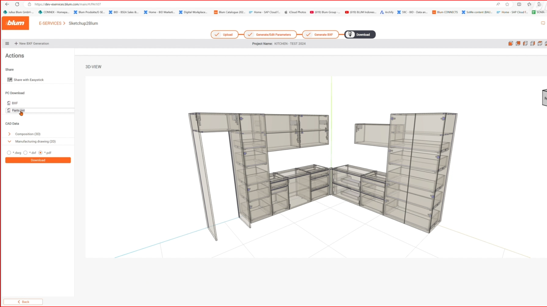 Once you've finished planning, the SketchUp2BXF service creates your individual Blum product parts list, production drawings for all wooden parts and an exact SketchUp 3D model.