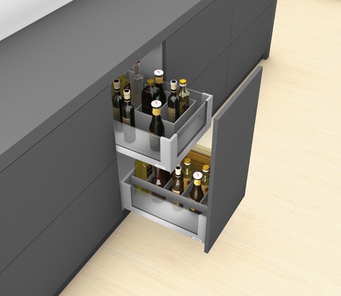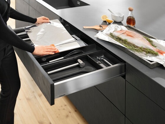 The Blum LEGRABOX range is as wide-ranging as the concept of home itself. Experience elegance with sleek design, clean lines and exceptional ease of motion. You can implement drawers, inner drawers, high-fronted pull-outs, and inner pull-outs in various colours, heights, nominal lengths, and load-bearing classes. Combine LEGRABOX with AMBIA-LINE inner dividing system to organise the box system and complement its straightforward, simple and slim design.