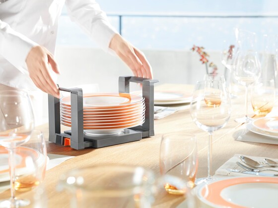 Stacks up to 12 plates securely, which can then be carried to the dining table.