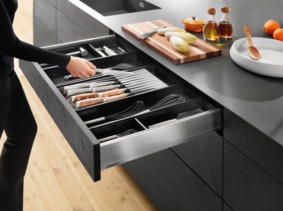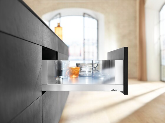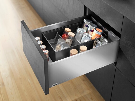 The Blum LEGRABOX range is as wide-ranging as the concept of home itself. Experience elegance with sleek design, clean lines and exceptional ease of motion. You can implement drawers, inner drawers, high-fronted pull-outs, and inner pull-outs in various colours, heights, nominal lengths, and load-bearing classes. Combine LEGRABOX with AMBIA-LINE inner dividing system to organise the box system and complement its straightforward, simple and slim design.
