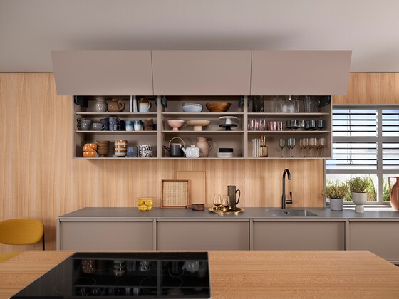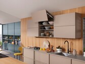 Wooden, thin, wide and narrow aluminium fronts are possible with AVENTOS top lift systems. You can even plan asymmetrical fronts and mitred and rebated applications or ceramic fronts for kitchen lift-up cabinets with AVENTOS top lift systems.