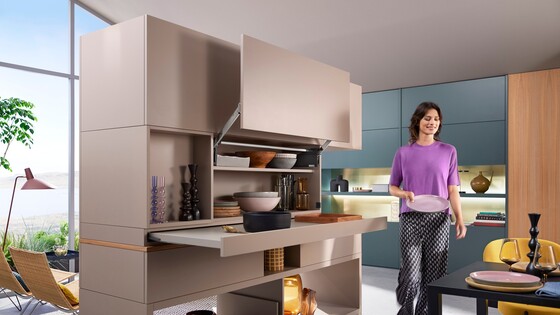 The upgraded Blum AVENTOS top lift systems are now compact. With symmetrical mechanisms and levers, fewer components, and the flexibility to integrate multiple motion technologies, designing wall cabinets becomes a breeze. Build exciting wall cabinets for living areas with AVENTOS top.