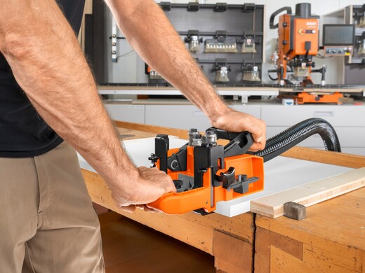 The new ECODRILL offers easy access from above using one hand. Now you can set two reference dimensions – the edge distance as well as the dimension to the centre of the hole. A standard drilling distance range of 2-8mm is incorporated     For bi-fold hinges, the required 12.5mm hole centre is also possible