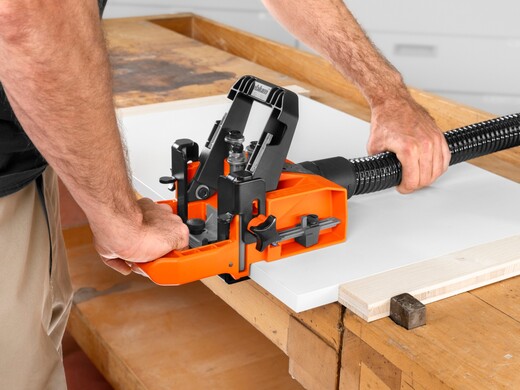 The side stops can be extended and retracted and have a measuring scale from 80–130 mm. This makes it easy to adjust standard distances without having to remeasure every time and work on a marking line. However, there is still the option of working with a marking line as before (for example, in cases where you have to assemble three hinges).