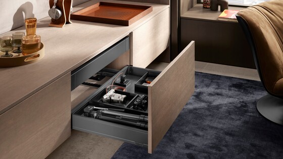 AMPEROS AC is the perfect match for BLUMOTION, TIP-ON BLUMOTION and SERVO-DRIVE and is easy to integrate in the MOVENTO and LEGRABOX pull-out systems.