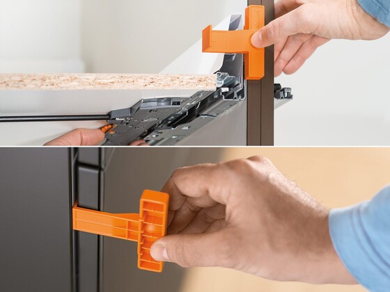 The synchronisation feature enlarges the trigger range and improves the TIP-ON BLUMOTION function. Two synchronisation options are available for different internal cabinet widths. Both can be mounted without tools.