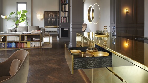 Epoca de aur revine – cel puţin în universul spaţiului de locuit. Laterala de sertar de culoare negru carbon mat este prevăzută cu un desen geometric, imprimat pe toată suprafaţa, care asigură un efect-surpriză de bun gust.