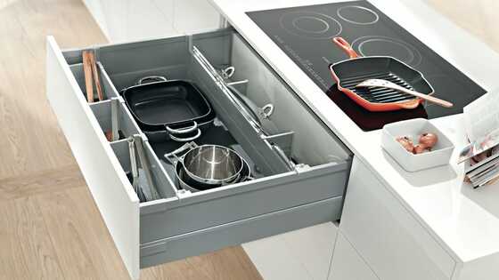 ORGA-LINE para caceroleros ofrece diferentes soluciones para diversas aplicaciones con TANDEMBOX antaro. Con los separadores transversales, los separadores longitudinales y el guardacuerpo transversal de aluminio a juego con el color del perfil todos los artículos tienen su lugar.