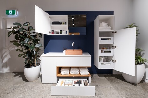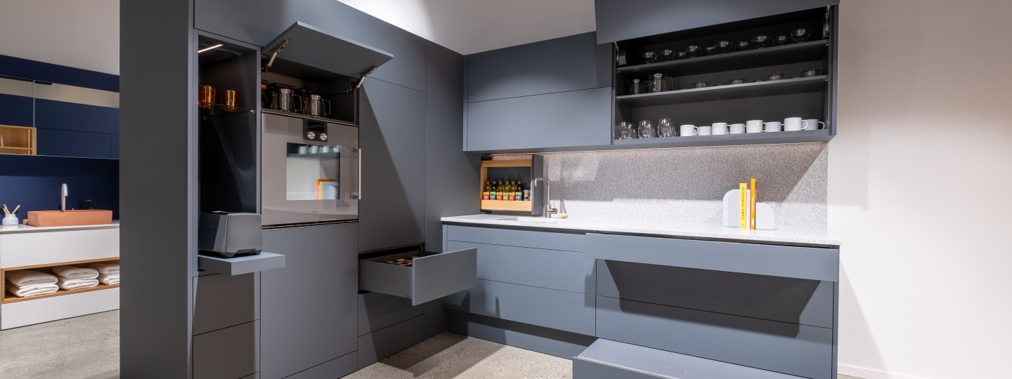 Touch, experience and feel the difference. The Blum exhibition space displays the latest products and innovations for your next home build or renovation project. Be inspired by our functional cabinet ideas for different living areas, from the kitchen to the bathroom, laundry, wardrobe and more.