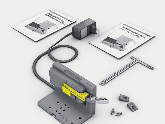 Set content: Pre-assembled SERVO-DRIVE unit plus bracket profile and attachments, drip protection, distance bumpers, 12 watt plug in transformer including cable, installation instructions and fitting template