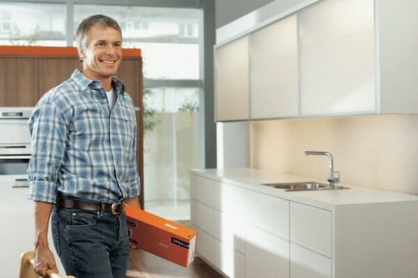 AVENTOS HK components are easy to assemble. Once the lift mechanism has been precisely adjusted to the weight and size of the front, the stay lift will open, close and hold with reliable ease. Transportation is easy. Lever arms are closed so there are no protruding parts.
