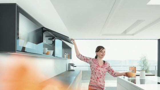 Pros appreciate the stay lift as an ideal solution for fitted units with heavy fronts. Fronts pivot up so very little space is needed above the cabinet. AVENTOS HK opens up and out of the user’s way so it can be left open during cooking.