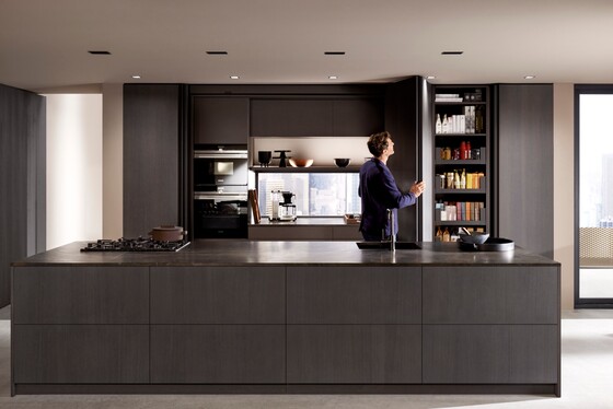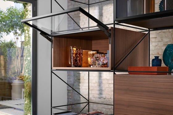 AVENTOS Hki to innowacyjny system Blum do szafek górnych z mechanizmem podnoszonych frontów. Ułatwia dostęp do zawartości, wpasowuje się w korpus mebla i idealnie komponuje się z estetyką współczesnych mebli.